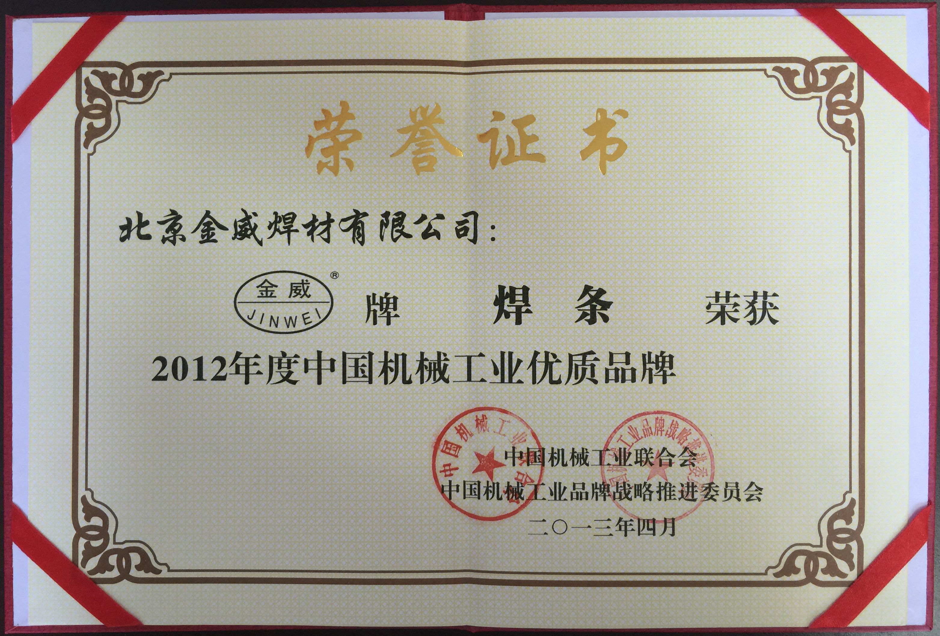 中國機械工業優質品牌證書